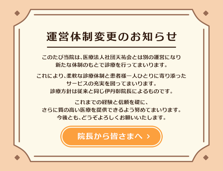 • 保険診療の予約は行なっておりません。診察はご来院頂いた順になりますので、ご理解の程宜しくお願いいたします。