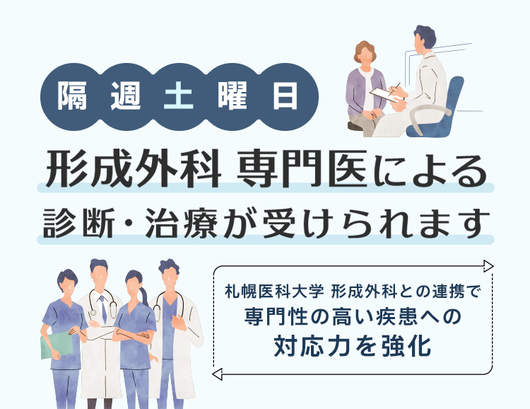 体の表面にある疾病に対して外科的な治療を行っています。外傷(切り傷、裂傷、裂け傷など)や、外傷による皮膚の変形や欠損をはじめ、先天的な変形や欠損に疾患に対して外科的なアプローチから機能の回復はもちろん、よりきれいな状態に整えることで生活の質を上げることを目的としています。