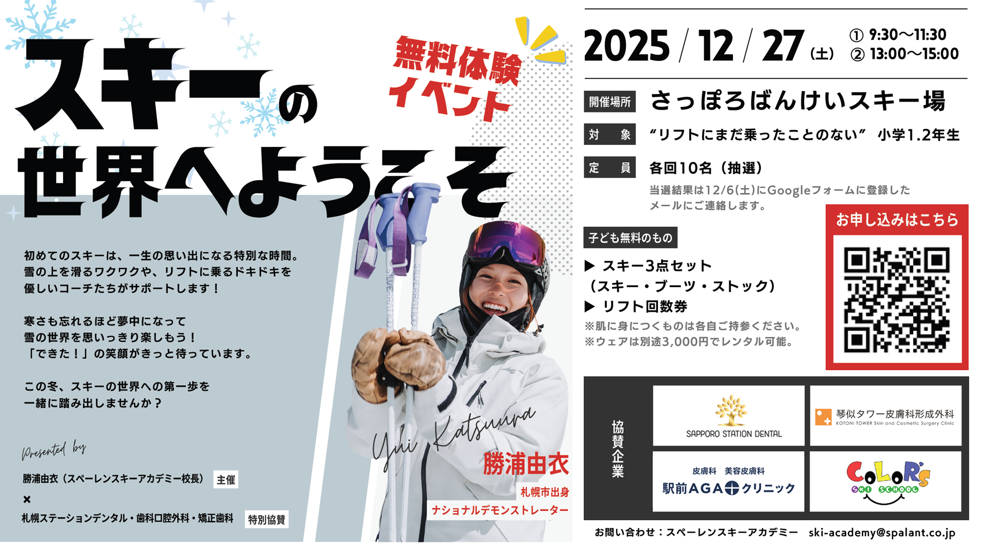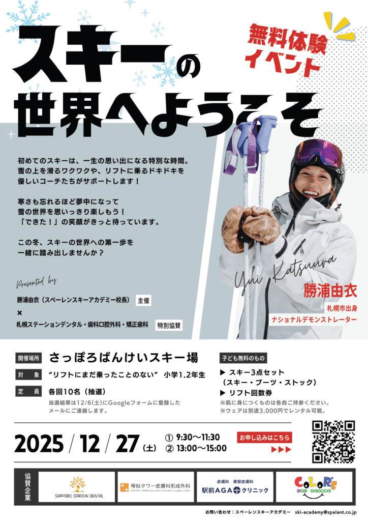 無料スキーイベント協賛のお知らせ お知らせ 2025.11.27 この度、当院はプロスキーヤー勝浦由衣さんによるスキー体験イベントに協賛いたします。 イベントの詳細や参加方法につきましては、下記チラシをご確認ください。 お申し込みフォームはこちら